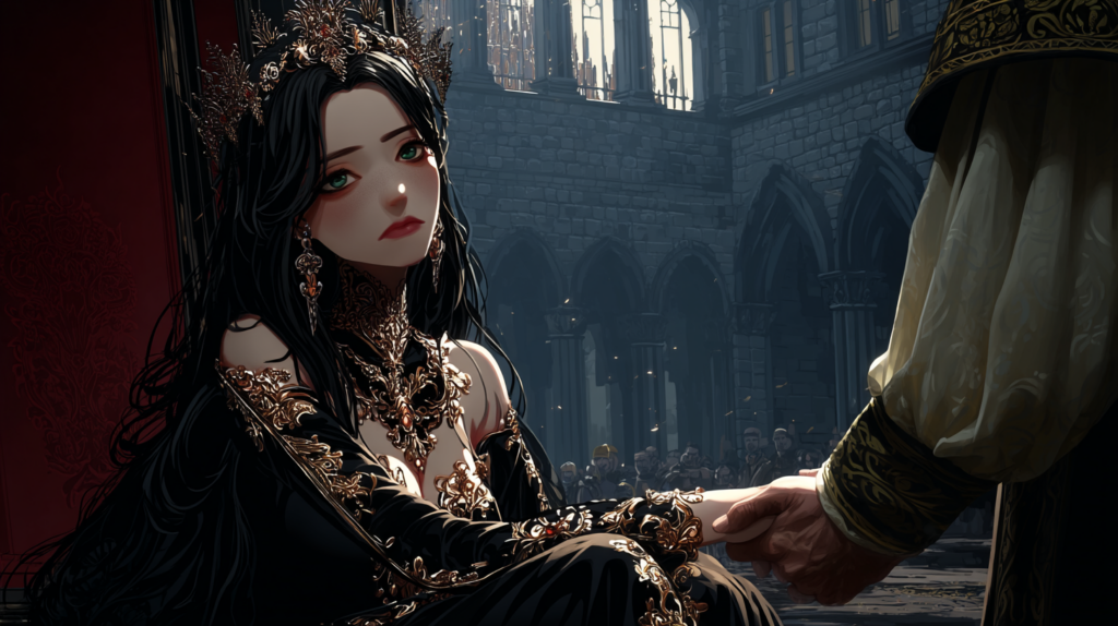 Yet beneath this poised and noble façade lies a secret turmoil: a duality of longing and restraint, of desire and conscience, shaping her choices and the destiny that clings to her like a shadow.